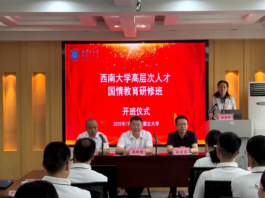2025年7月5日上午,西南大学高层次人才国情教育研修班在公司赛罕校区开班。西南大学党委副书记武好明、太阳成集团tyc122ccvip党委委员、副董事长杜晓东、西南大学党委常委、组织部部长曾庆洪出席了开班仪式。